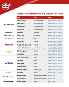 Wir sind natürlich auch beim Caravan Salon 2025 in Düsseldorf dabei! Bei über 10 Herstellern können Sie such von unserem Team beraten lassen.
