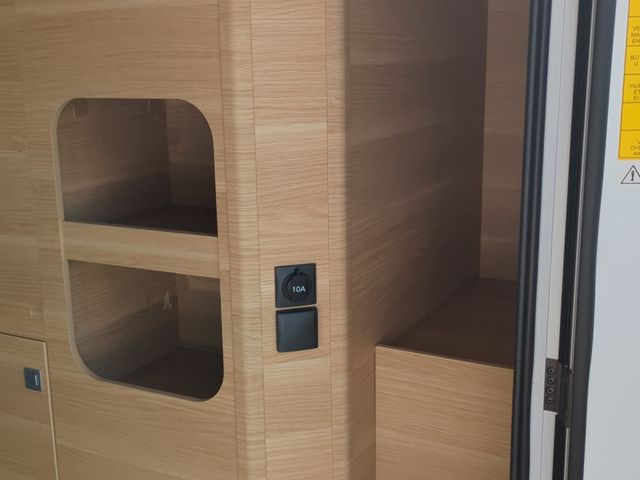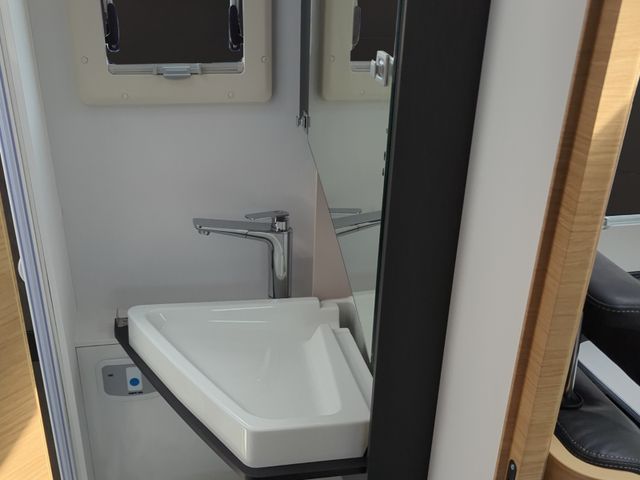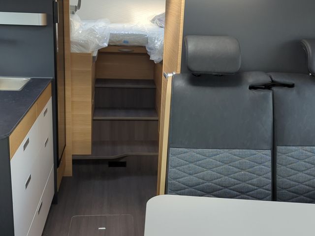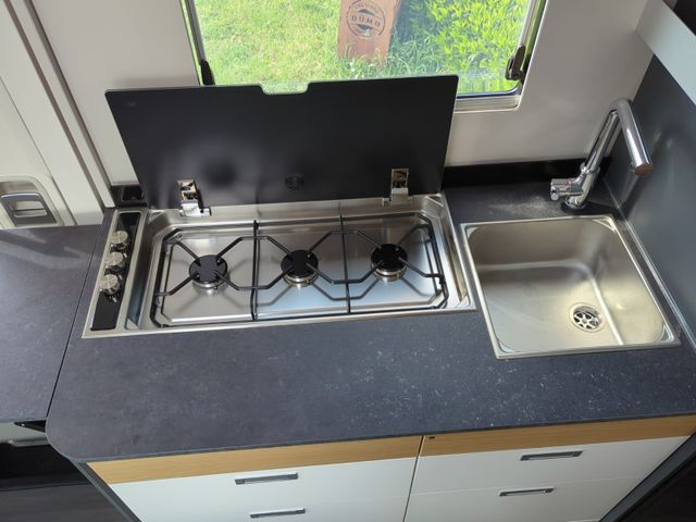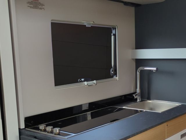 AGM-Wohnraumbatterie 100 Ah, Ladestation 230 V / 12 V in Garage, Sicherheits-Gasregler MonoControl CS mit Filter, Dunstabzug, Abdeckung Kocher + Spüle, Abtropfschale, Rückfahrwarner, Wohnraumfenster mit Rahmen, Panorama-Dachhaube