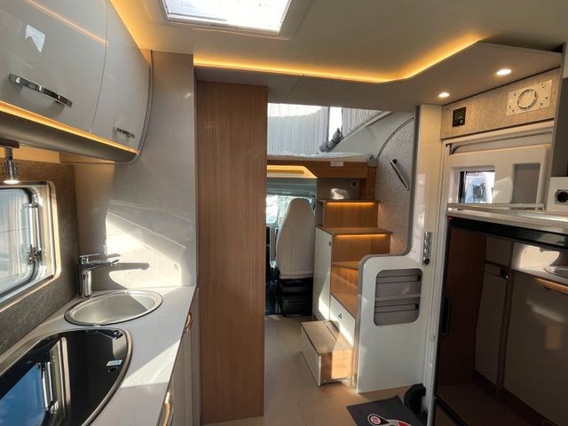 Pluspunkte Interieur2. Wohnetage mit Arbeitsfläche und Schlafplatz, Fest eingebaute Treppe mit integrierten Staufächern, Designvolles Barelement mit Wandlampe (Home Light) und Dockingstation, Großes Heckbad mit separater Dusche und großem Kleiderschrank (T 689 G) oder platzsparendes Vario-Bad (T 649 G), Ergonomisch angepasste Zugänge zu Bad, großer Garage, Bett und Wohnraum, Rundsitzgruppe im Heck mit Umbaumöglichkeit und optionales Hubbett für zusätzliche Schlafplätze (T 649 G)