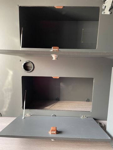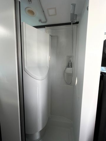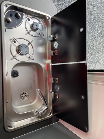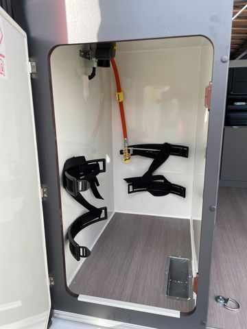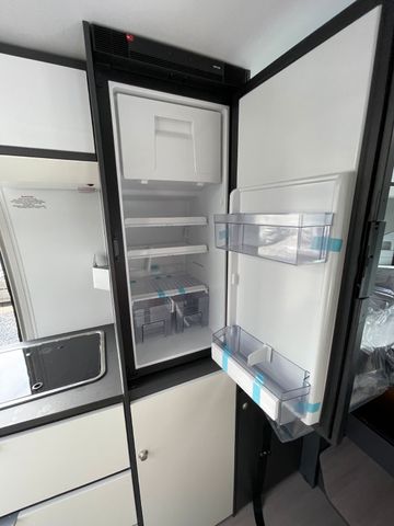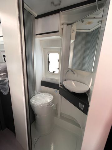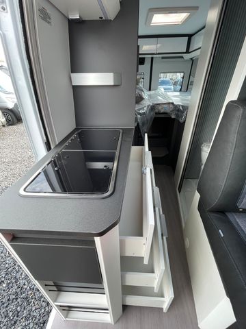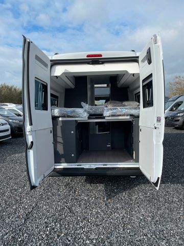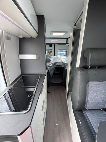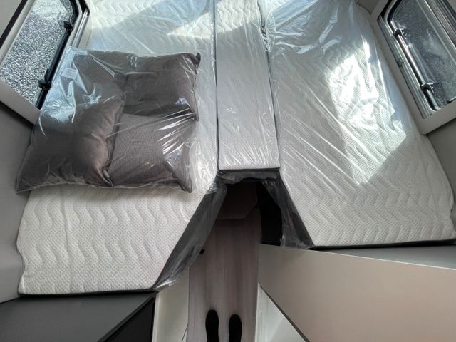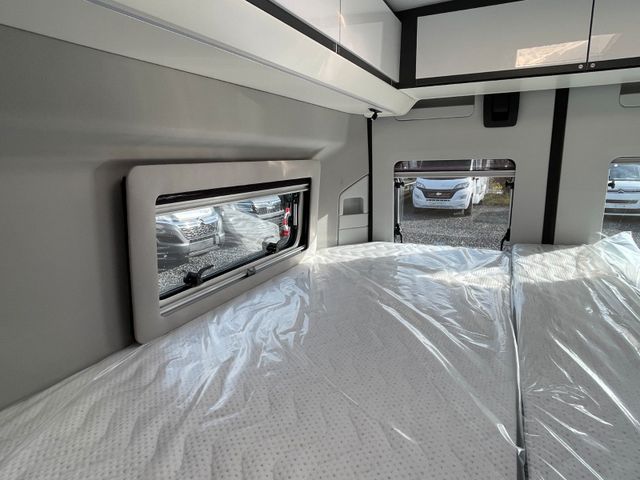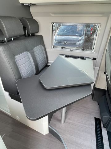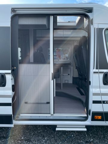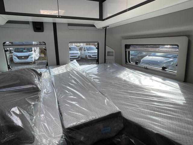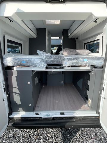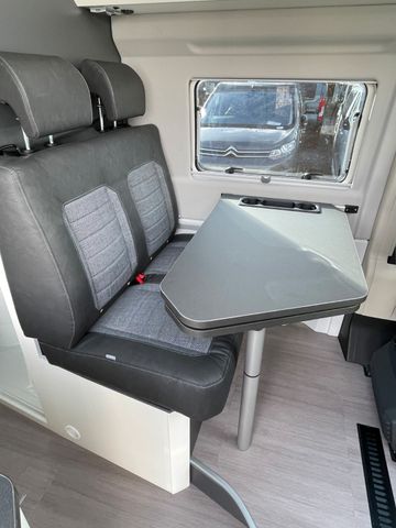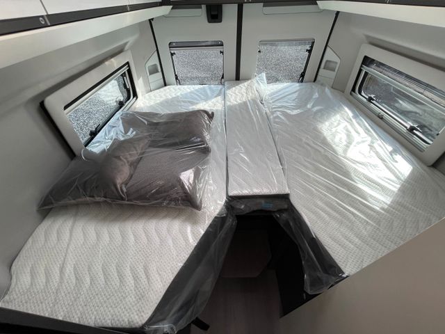 Serienpolster: Arno, Farbe: Eisengrau, Rückfahrkamera + Rückspiegelmonitor, Querbett Dinette, Lackierung Stoßfängerecken vorne, Zuziehhilfe Schiebetür (nur mit Kit DE LUXE)