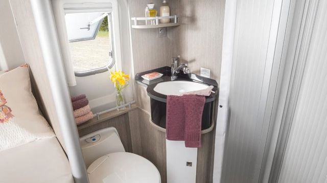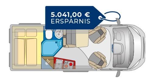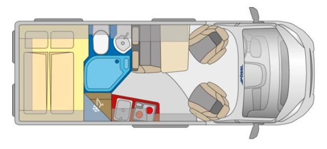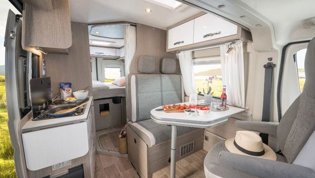 Einen besonderen Komfort bietet der 2Win R Plus: Mit einem praktischen Lamellenrollo entsteht ein extra großes Raumbad. Bei Bedarf lässt sich dadurch auch der Schlaf- vom Wohnbereich abtrennen. Fertig ist der Badkomfort, wie man ihn von zu Hause kennt! Darüber hinaus wartet die R-Version mit einem must-have für alle „Lang“-Schläfer auf: ein großes, bequemes Bett. Passend dazu: Ein hochgesetzter Kühlschrank, unter dem ein großer Hängeschrank für allerlei Stauraum sorgt.