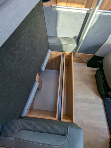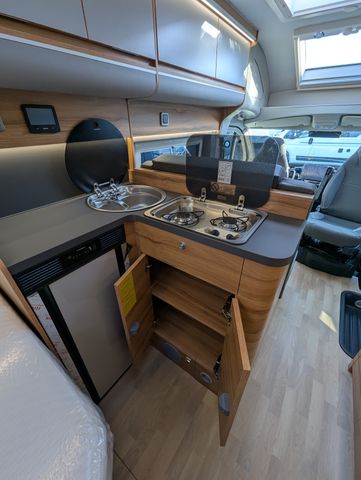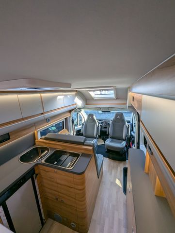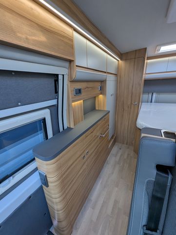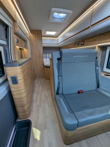 Breite, komfortable Schiebetüren führen in den geräumigen Innenraum des Wohnmobils. Von Fächern und Schränken bis hin zur technischen Ausrüstung ist alles leicht zugänglich.Eine L-förmige Küche mit einer großen Platte, eine in die Toilette integrierte Duschkabine, ein gemütliches Esszimmer und die Schlafzimmer machen Affinity zu einem sehr komfortablen Wohnmobil.