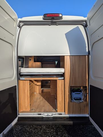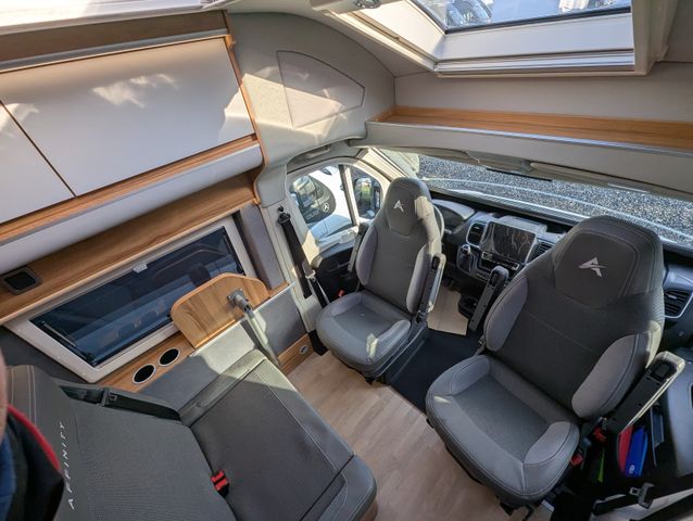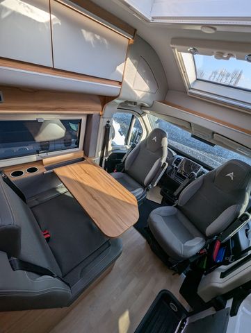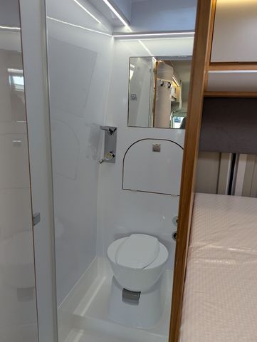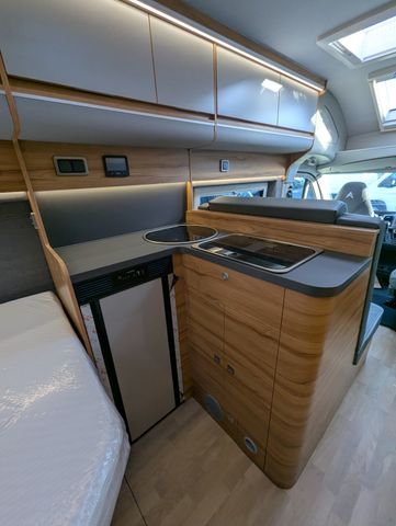 Französisches Bett mit regulierbarem Kopfende, Warmluftheizung mit Boiler Truma Combi, Doppelboden, Fahrerhausverdunklung, Elektrische Eintrittsstufe (70 cm), Insektenschutz Plissee für Seitenschiebetür, Wireless Ladegerät, Dachfenster mit elektrischem Ventilator im Bad, Dachfenster mit elektrischem Ventilator in der Küche