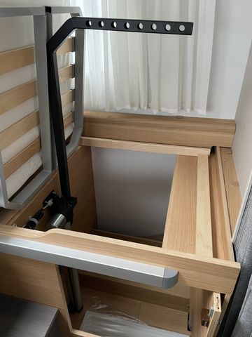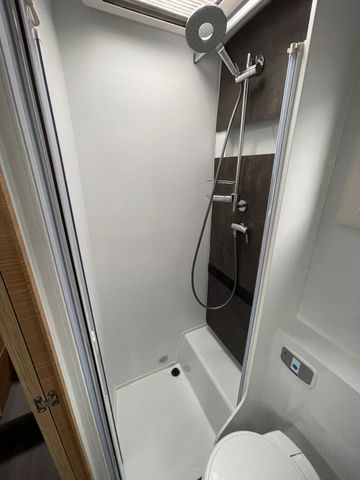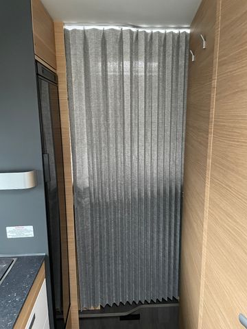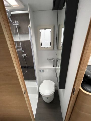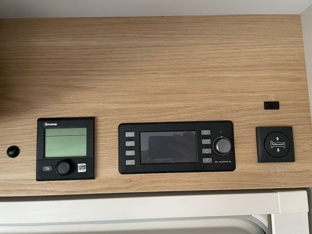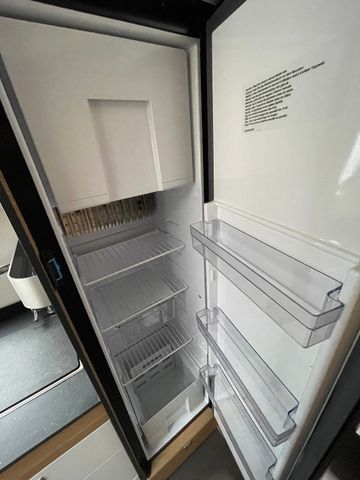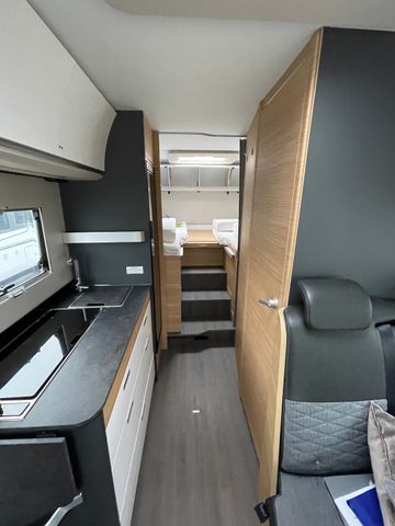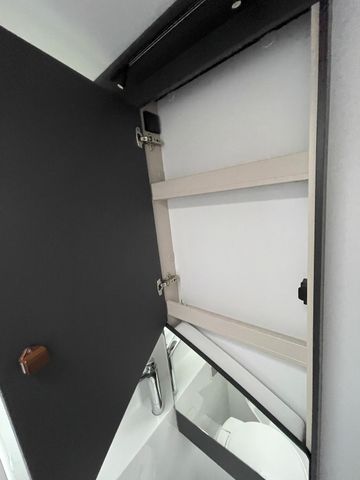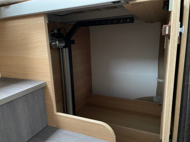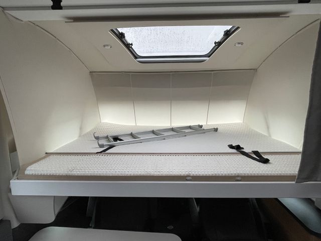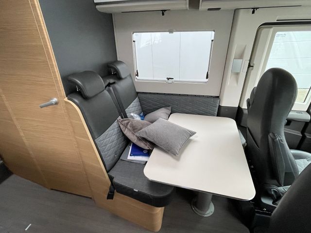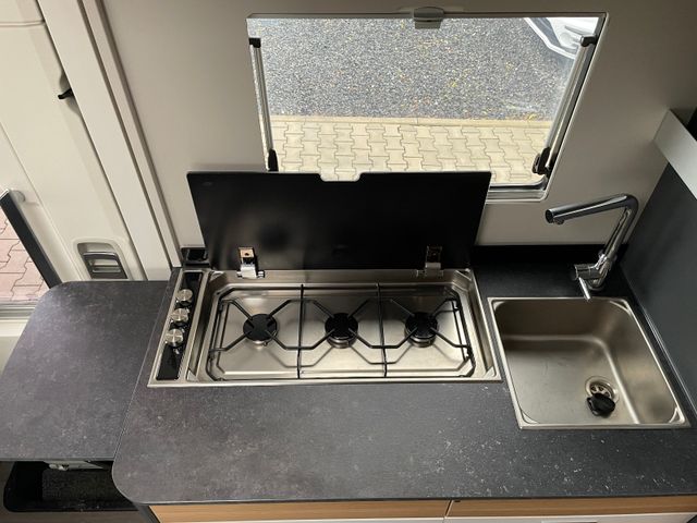 AGM-Wohnraumbatterie 100 Ah, Ladestation 230 V / 12 V in Garage, Sicherheits-Gasregler MonoControl CS mit Filter, Dunstabzug, Abdeckung Kocher + Spüle, Abtropfschale, Rückfahrwarner, Wohnraumfenster mit Rahmen, Panorama-Dachhaube