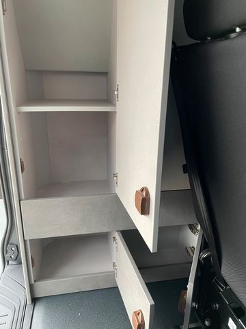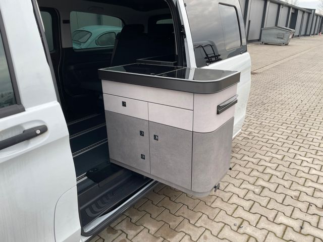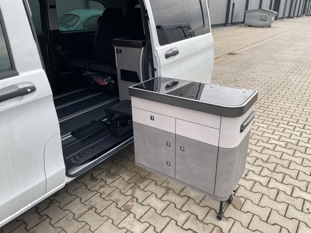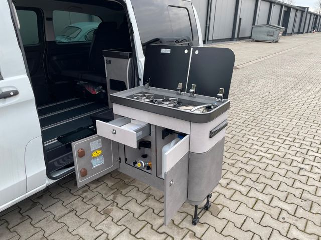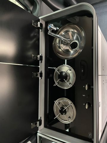 Küchenblock Easy Move Kitchen mit Kocher und Spülbecken, 2er Sitz-/Schlafbank, Hochwertiger Möbelbau mit zahlreichen Verstaumöglichkeiten, Beistelltisch mit Aufsteckfuß verstaubar am Küchenblock, CEE-Außenanschluss für 230V mit Sicherungsautomat, USB- u. 220V Anschl. im Fond, USB-Anschl. im Aufstelldach, 95Ah Aufbaubatterie mit Ladebooster für optimierte Ladung, Ladeautomat 18A mit elektronischer Abschaltautomatik