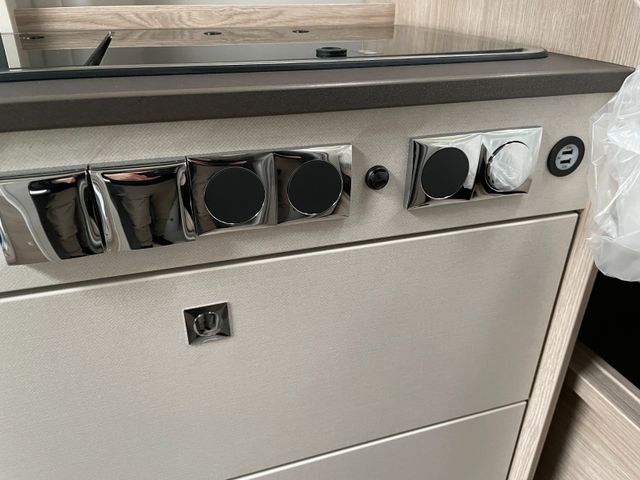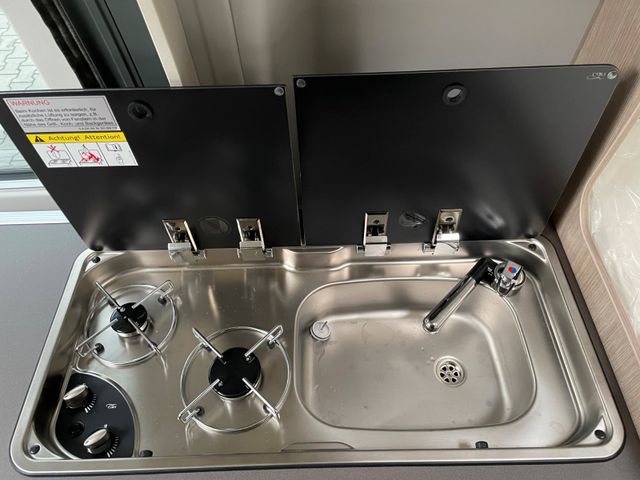 Möbeldekor Brava, Einhängetisch mit drehbarer Verlängerung, Aufstiegshilfe für Heckdoppelbetten in Schottwand integriert, Mehrzonen Komfortschaum Matratzen für alle Bettvarianten, Heckdoppelbett quer, Heckstauraum mit integrierten Verzurrösen, Beheizter doppelter Boden mit Staumöglichkeiten, Isofix System für einen Kindersitz, Küche 2-Flammen-Kocher mit integrierter Spüle und separater Glasabdeckung, Kompressorkühlschrank 69 L (davon Gefriefach 7,5 L), Multifunktionsschiene für optionale Küchenerweiterung