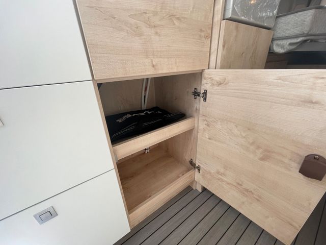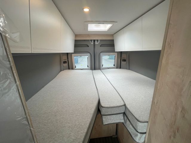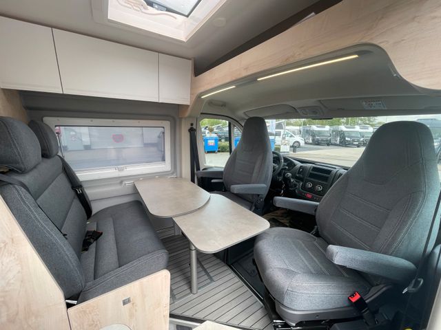 Runner Light Serienausstattung, Sitzbezüge in Serienausführung, Dachhaube Bad (28 x 28 cm), Betten im Heck hochgesetzt, Isofix-Vorrichtungen auf beiden Plätzen der Sitzbank, Truma Fensterschalter, Gasheizung unter der Sitzbank (statt wie üblich im Heck), 3er-Steckdosenset (USB, 12V, 220V) unter dem Tisch in der Dinette, Vorfracht enthalten, Fahrzeugpapiere vollständig, Neufahrzeug-Deckung (außer Schweiz), Transportzone 3