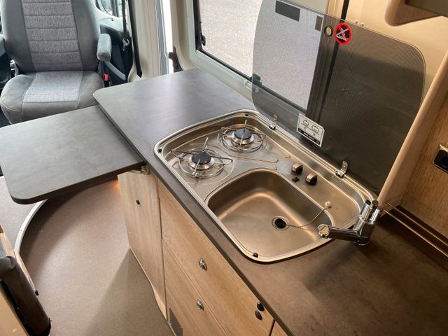 Polster Samba, Aufstelldach in Fahrzeug-Farbe, Bettverbreiterung 3. Schlafplatz quer, Tisch mit Ausdrehteil, Ambiente-Licht im Aufstelldach, Bordbatterie zusätzlich, Lichtkranz (indirekte Beleuchtung), Zusätzlicher Steckdosensatz 230V/USB, Truma Bedienteil iNet X, Gas