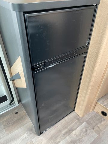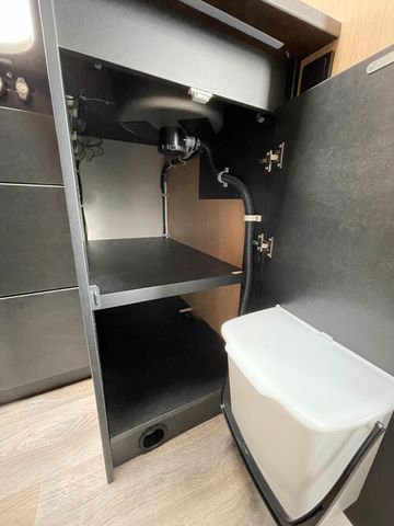 Wohnwelt Adventure, Chassisfarbe Obsidian Schwarz, 6,5x16 Zoll Alufelgen schwarz, Design-Applikation Heck, Fenster in Fronthaube, Rahmenfenster, Außenstauraumklappe, Beklebung Adventure schwarz / Seitenwand silber, Seitenwände Glattblech silber metallic, Schriftzug Adventure, Bettenumbau Einzelbetten zu Doppelbett, Großer Kühlschrank 156 l mit separatem Frosterfach 29 l, Hubbettsystem mit Clima-Plux-Elementen, Holzrost in der Dusche, Faltverdunkelung Fahrerhaus