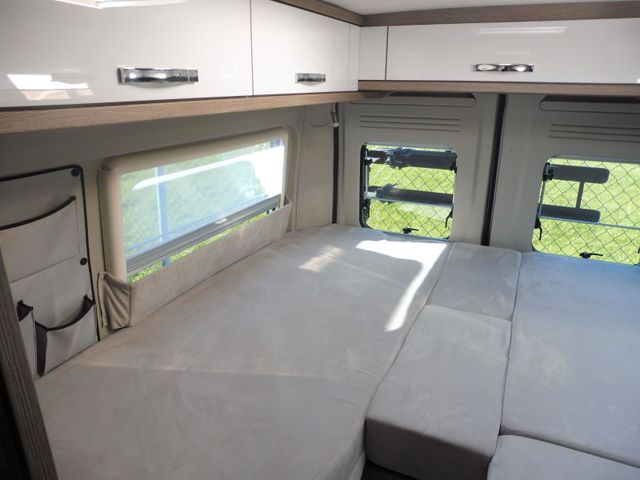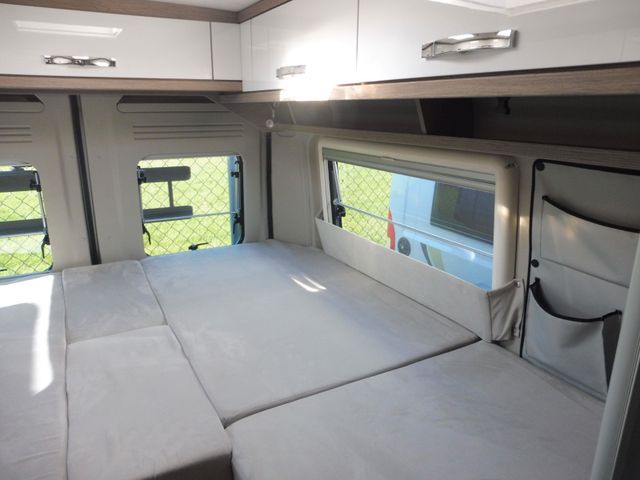 Schlafen: Heckbetten mit großzügiger Liegefläche, Vergrößerung der Heckgarage durch stapelbare Heckbetten, Zusätzliche Staufächer unter den Heckbetten, Großzügige Dachstauschränke mit üppigem Stauvolumen, Zusätzliche offene Ablagen unterhalb der Dachstauschränke