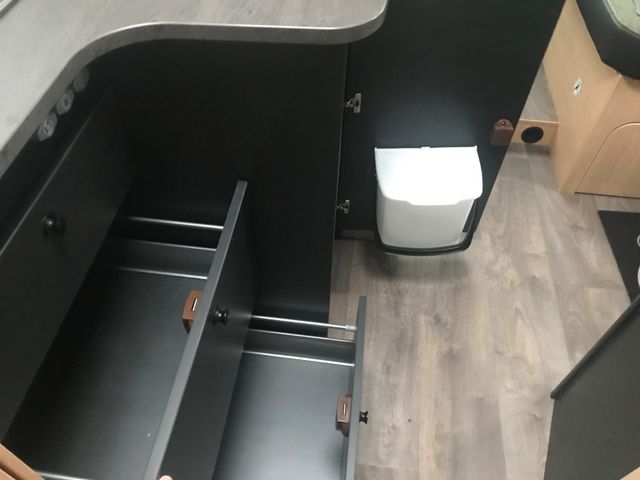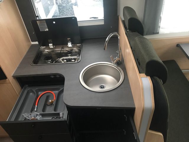 Ergonomisch angeordnete Küche mit großzügiger Arbeitsfläche, Geräumige Schubkästen mit Servo-Soft im, Küchenblock, Großes Rundspülbecken aus Edelstahl, Wassertank inkl. Boiler 122 l, Abwassertank 92 l, Kühlschrank mit extra Frosterfach, LED-Band, Abfalleimer, Zwei-Flammkocher mit 12 V Zündung und, Glasabdeckung