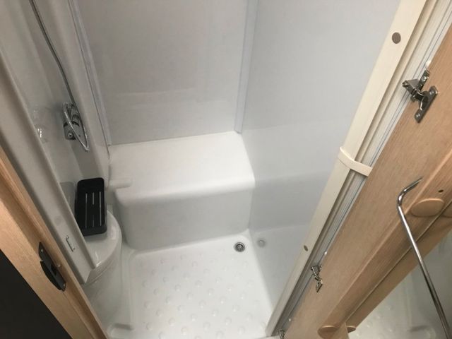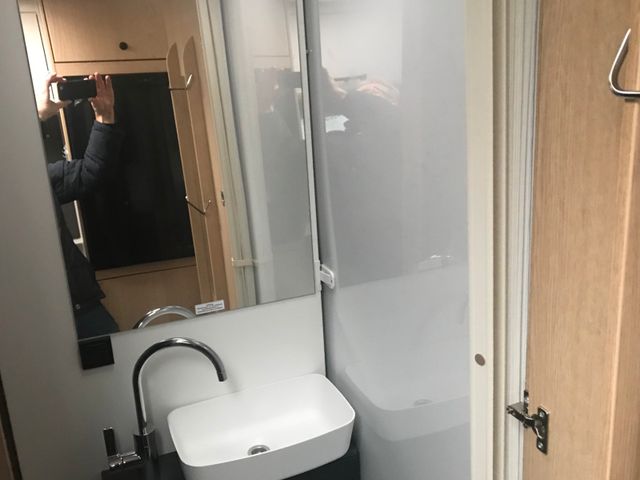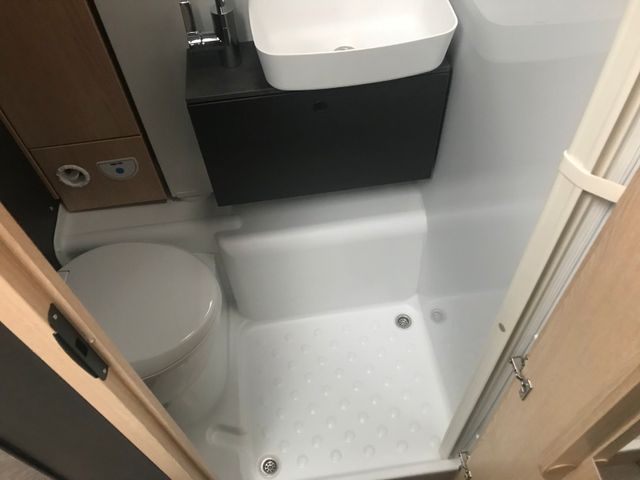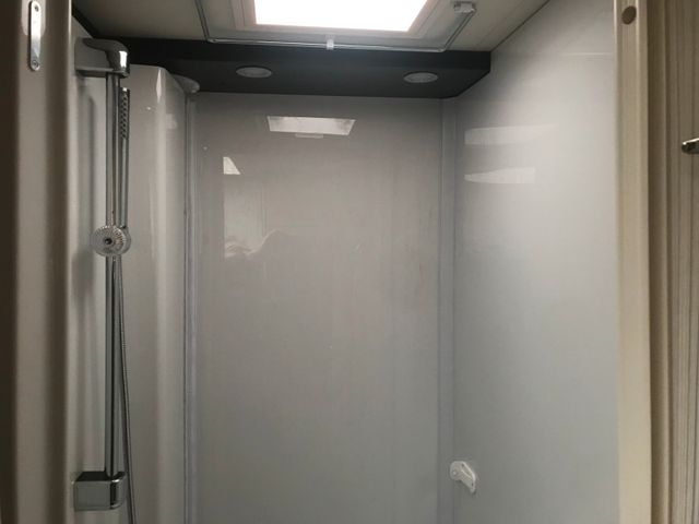 Cassettentoilette mit elektrischer Pumpe und drehbarem Sitz, Dachhaube mit integriertem Insektenschutzrollo(modellabhängig), Große Spiegelflächen, Kleiderstange in der Nasszelle, Duschraumverkleidung