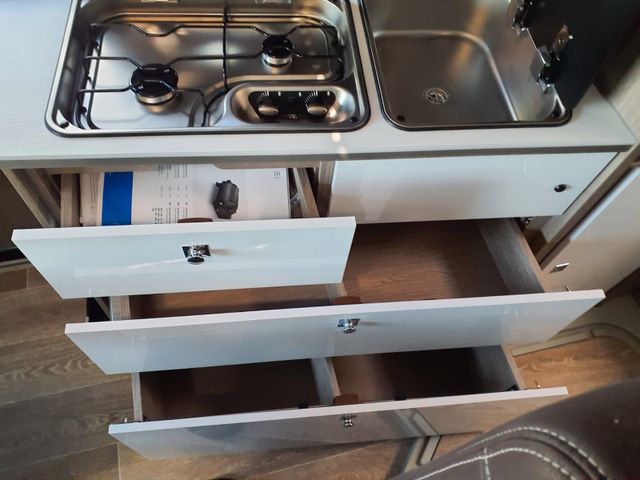 Leistungsstarke Truma Combi Heizung mit 10l Boiler, Angenehmer Schlafkomfort durch zusätzlichen Warmluftauslass im Hecktürbereich, Wasserversorgung über zuverlässiges Pumpensystem, Großzügiger Gasvorrat in bequem erreichbarem Gaskasten, CEE-Außenanschluss für 230 V mit Sicherungsautomat, Elektroschaltzentrale gut zugänglich unter dem Fahrersitz, Leistungsstarke Aufbaubatterie, Multifunktions-Panel, leicht bedienbar über der Eingangstür, Verstellbare Spots auf Schienensystem unter den Dachschränken sorgen für optimale Ausleuchtung