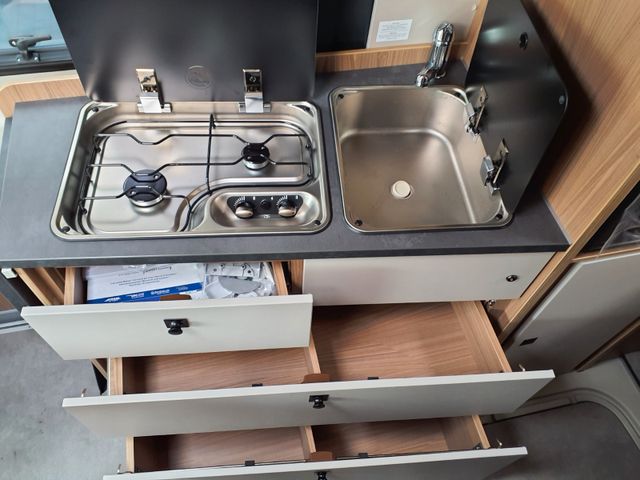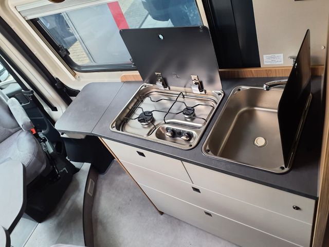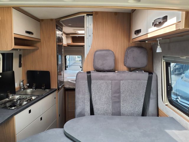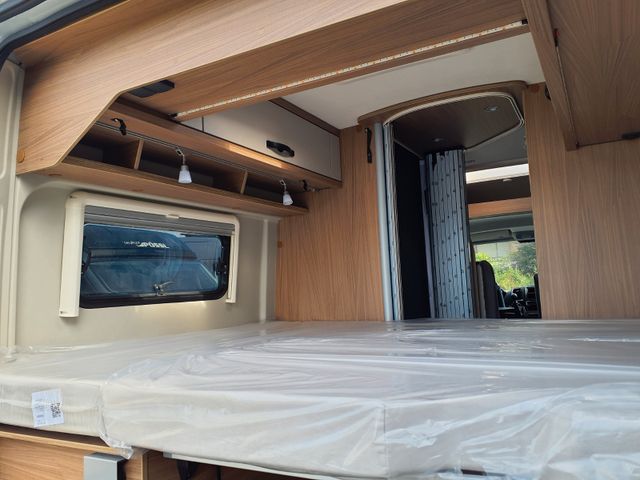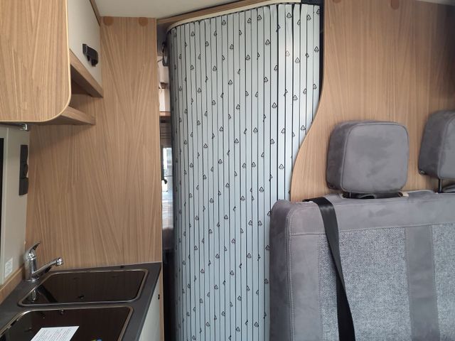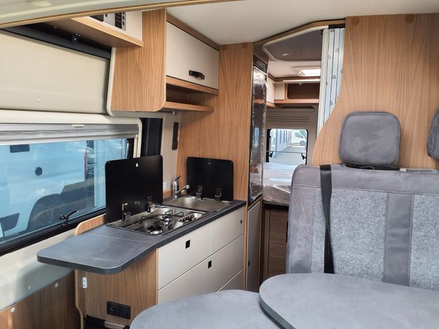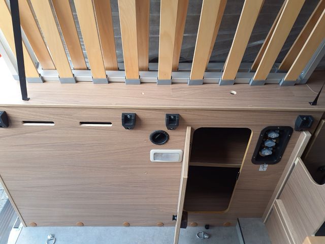 Holzdekor Breeze, Polster Melange, Bettverbreiterung 3. Schlafplatz quer inkl. Tischplatte alternativ, Truma Bedienteil CP Plus, GasDuo Control CS, zusätlische Bordbatterie, Elektropaket für Aufbau(USB/230V-Steckdose), Rahmenfenster statt vorgehängte Fenster