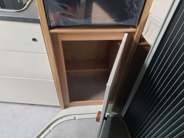 Beschläge und Auszüge in massiver Metallausführung in Haushaltsqualität, Große Dachschränke bieten viel Stauraum, Praktische, mit Druckknöpfen befestigte Müllbeuteltasche im Eingangsbereich (grundrissabhängig)