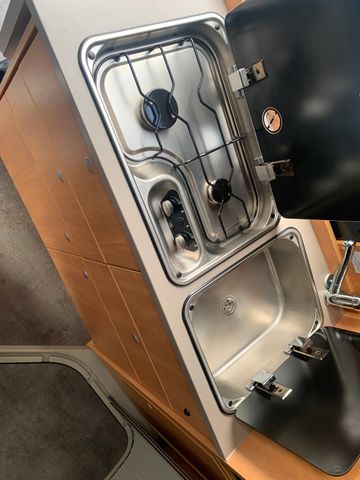 Küche: Arbeitsplatte mit robuster Oberfläche und stoßfester Frontkante, Extra breite und rollengelagerte Küchenauszüge für mehr Stauvolumen, Wegklappbare Arbeitsflächenerweiterung auf der Eingangsseite (grundrissabhängig), Kühlschrank mit integriertem Frosterfach, 2 Flamm-Kocher mit Piezozünder und Glasabdeckung für zusätzliche Abstellfläche und Spritzschutz, Edelstahlspüle mit Glasabdeckung/Schneidebrett,