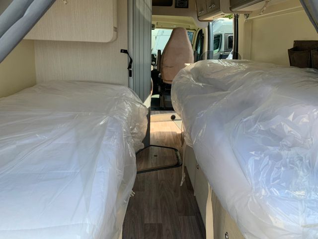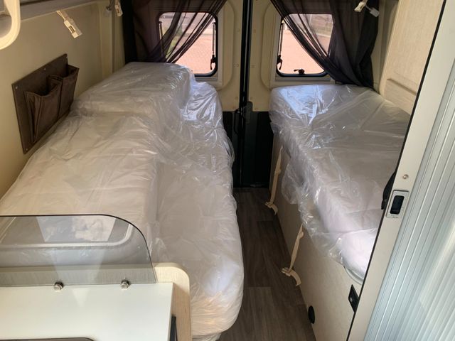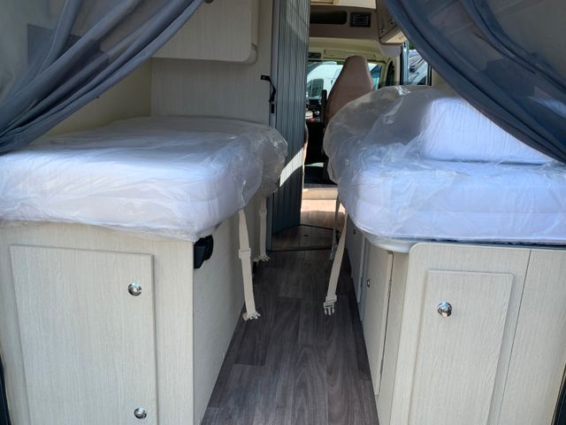 Schlafen: Heckbetten mit großzügiger Liegefläche, Vergrößerung der Heckgarage durch stapelbare Heckbetten, Zusätzliche Staufächer unter den Heckbetten, Großzügige Dachstauschränke mit üppigem Stauvolumen, Zusätzliche offene Ablagen unterhalb der Dachstauschränke