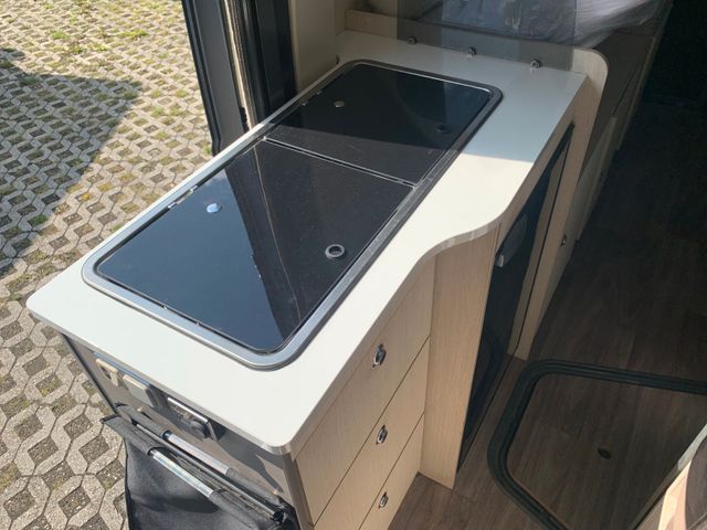 Küche: Wegklappbare Arbeitsflächenerweiterung auf der Eingangsseite, Kühlschrank mit integriertem Frosterfach, 2 Flamm-Gaskocher mit Glasabdeckung für zusätzliche Abstellfläche und Spritzschutz, Edelstahlspüle mit Glasabdeckung/Schneidebrett,