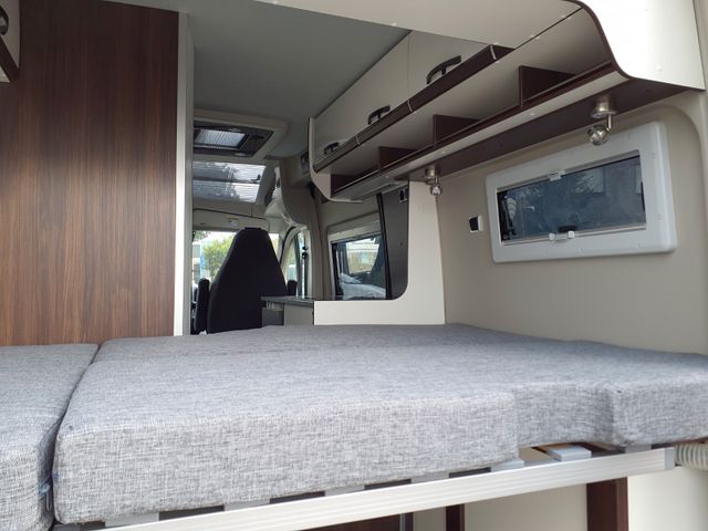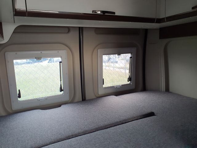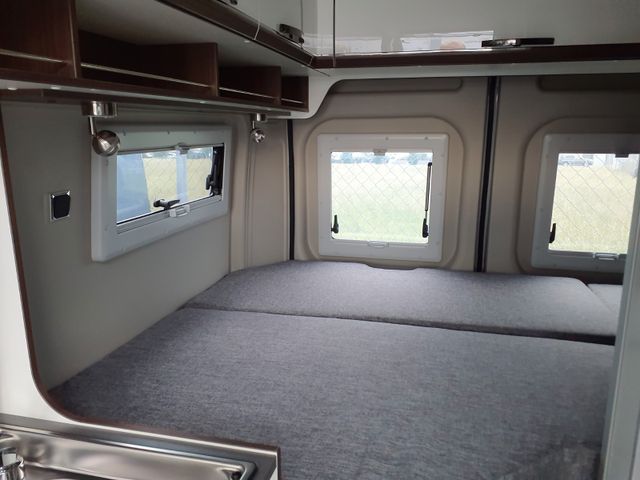 Schlafen: Heckbetten mit großzügiger Liegefläche, Vergrößerung der Heckgarage durch stapelbare Heckbetten, Zusätzliche Staufächer unter den Heckbetten, Heckbereich ausgebaut mit rundumlaufenden Dachstauschränken
