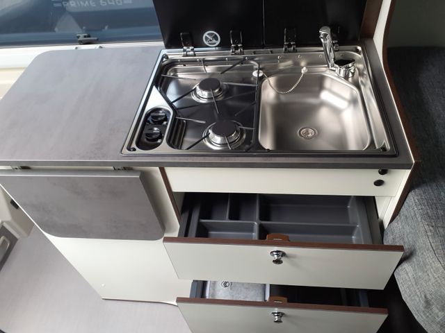 Holzdeker: Palisander, Polster: Samba, Zusätzlicher Steckdosensatz 230V/USB, Truma Bedienteil iNet X, Gas
