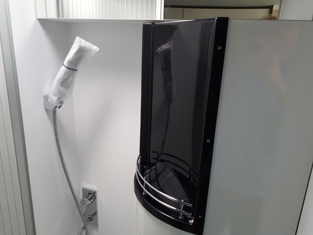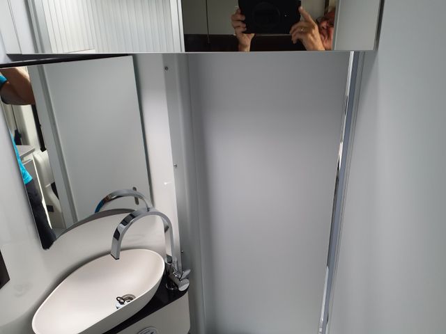 Bad: Handbrause in Chromoptik, Einhebelmischarmatur mit hochwertiger Keramikabdichtung, Variable Schwenkwand für optimale Platzausnutzung, Schwenktoilette für mehr Bequemlichkeit und Keramik-Inlay für einfaches Reinigen, Spiegel mit indirekter Beleuchtung und zusätzlichem Leuchtpanel in der Dusche (nur 540er)