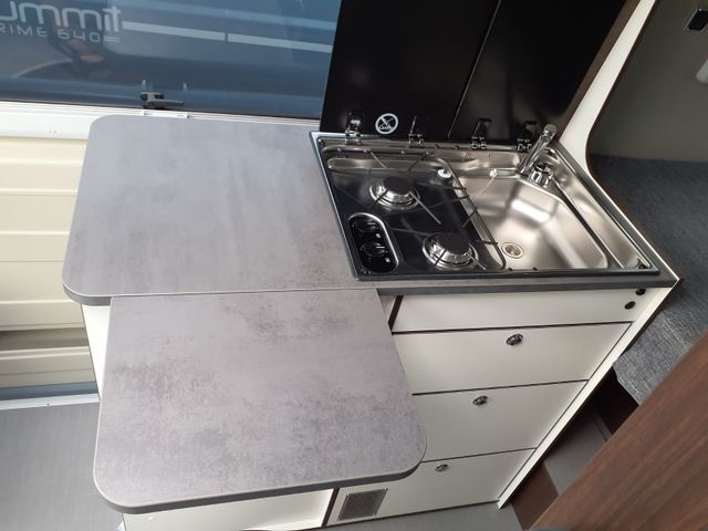 Küche: Hochwertige Arbeitsplatte mit robuster Oberfläche, Kühlschrank mit integriertem und herausnehmbarem Frosterfach, 2-Flammkocher mit Piezozünder und Glasabdeckung für zusätzliche Abstellfläche und Spritzschutz, Edelstahlspüle mit Glasabdeckung