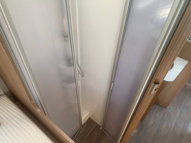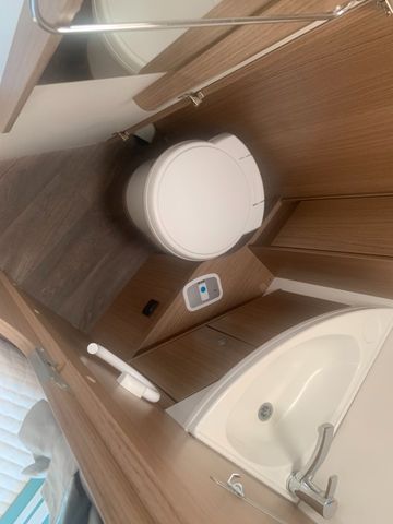 Cassettentoilette mit elektrischer Pumpe und drehbarem Sitz, Dachhaube mit integriertem Insektenschutzrollo(modellabhängig), Große Spiegelflächen, Duschraumverkleidung