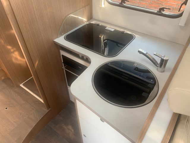 Ergonomisch angeordnete Küche mit großzügiger Arbeitsfläche, Geräumige Schubkästen, Küchenblock, Großes Rundspülbecken aus Edelstahl, Wassertank inkl. Boiler 122 l, Abwassertank 92 l, Kühlschrank, Glasabdeckung