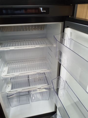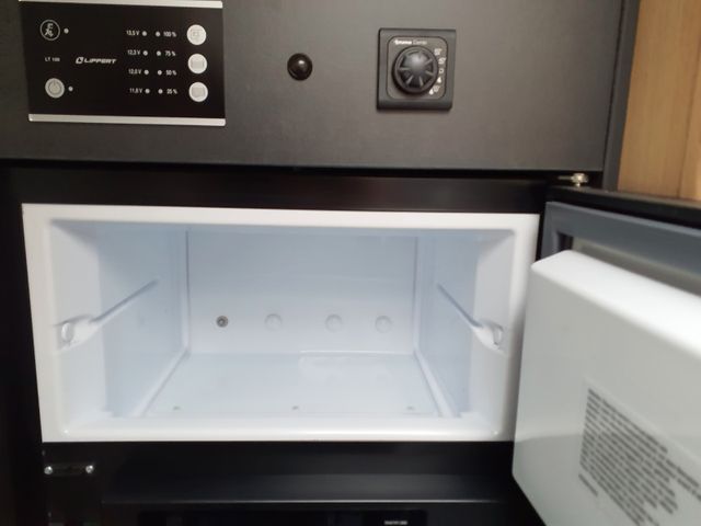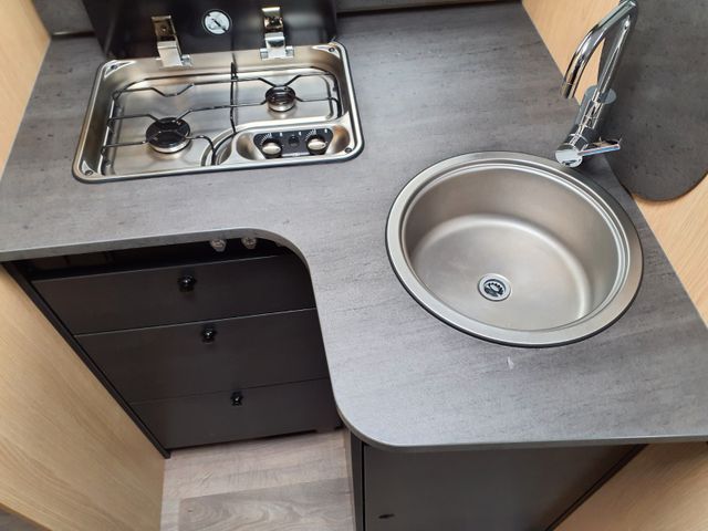 Ergonomisch angeordnete Küche mit großzügiger Arbeitsfläche, Geräumige Schubkästen mit Servo-Soft im, Küchenblock, Großes Rundspülbecken aus Edelstahl, Wassertank inkl. Boiler 122 l, Abwassertank 92 l, Kühlschrank mit extra Frosterfach, LED-Band, Abfalleimer, Zwei-Flammkocher mit 12 V Zündung und, Glasabdeckung