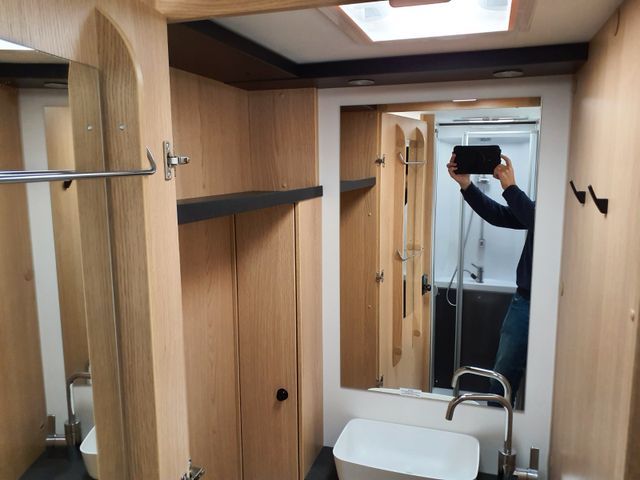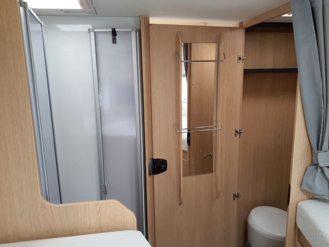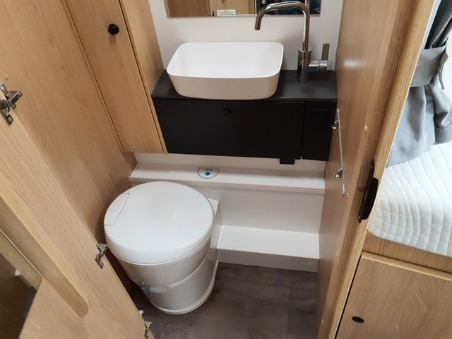 Cassettentoilette mit elektrischer Pumpe und drehbarem Sitz, Dachhaube mit integriertem Insektenschutzrollo(modellabhängig), Große Spiegelflächen, Kleiderstange in der Nasszelle, Duschraumverkleidung