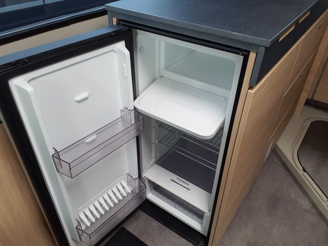 Küche: Arbeitsplatte mit robuster Oberfläche und stoßfester Frontkante, Extra breite und rollengelagerte Küchenauszüge für mehr Stauvolumen, Wegklappbare Arbeitsflächenerweiterung auf der Eingangsseite (grundrissabhängig), Kühlschrank mit integriertem Frosterfach, 2 Flamm-Kocher mit Piezozünder und Glasabdeckung für zusätzliche Abstellfläche und Spritzschutz, Edelstahlspüle mit Glasabdeckung/Schneidebrett,
