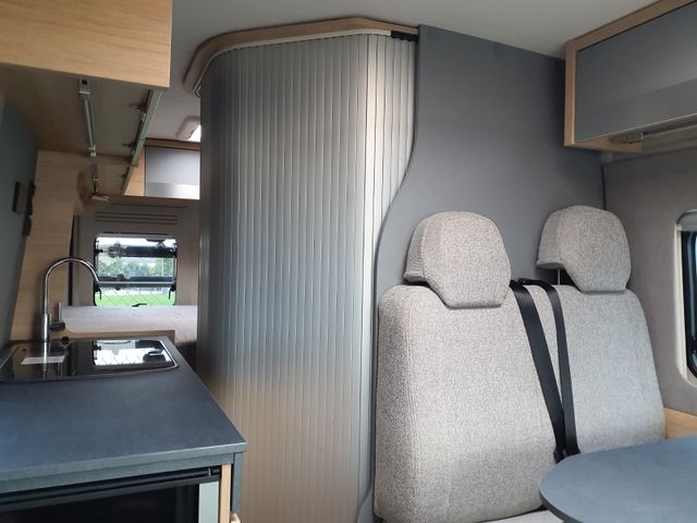 Wohnraum: Wohnraummöbel mit pflegeleichten Oberflächen, Fahrerhaussitze komplett in die Wohnsitzgruppe integrierbar, Bei einigen Grundrissen großzügiger Stauraum in der Sitzbank, Beschläge und Auszüge in massiver Metallausführung in Haushaltsqualität, Große Dachschränke bieten viel Stauraum, Praktische, mit Druckknöpfen befestigte Müllbeuteltasche im Eingangsbereich (grundrissabhängig)