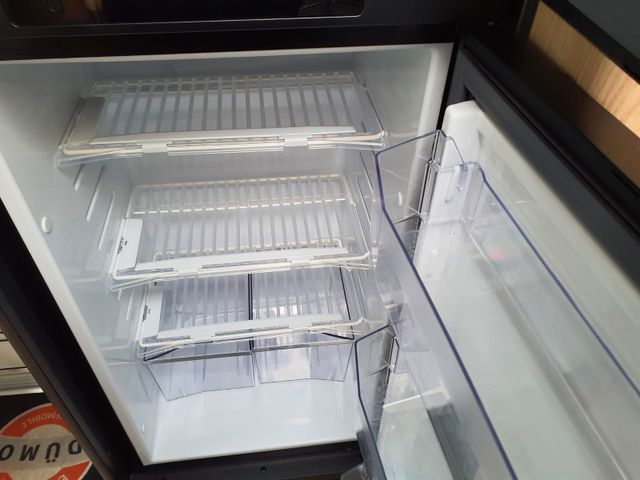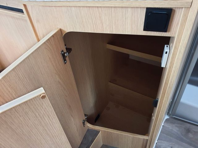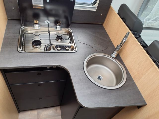Ergonomisch angeordnete Küche mit großzügiger Arbeitsfläche, Geräumige Schubkästen mit Servo-Soft im, Küchenblock, Großes Rundspülbecken aus Edelstahl, Wassertank inkl. Boiler 122 l, Abwassertank 92 l, Kühlschrank mit extra Frosterfach, LED-Band, Abfalleimer, Zwei-Flammkocher mit 12 V Zündung und, Glasabdeckung