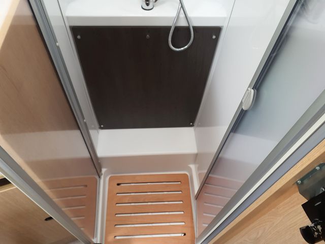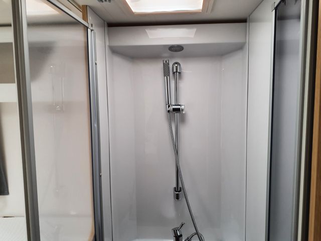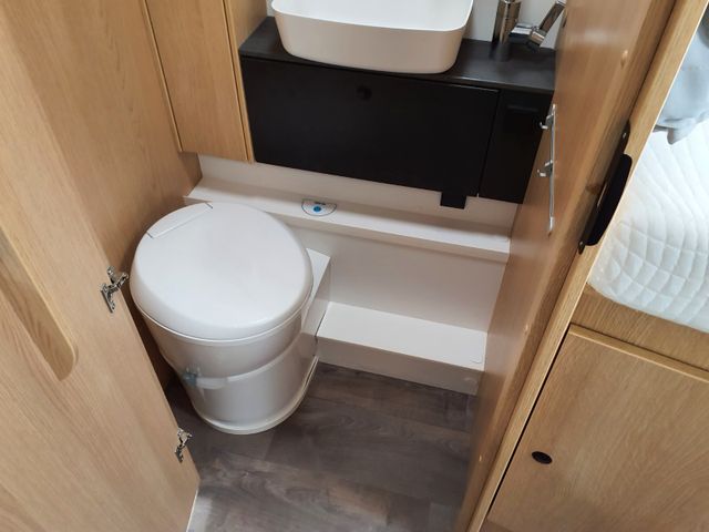 Cassettentoilette mit elektrischer Pumpe und drehbarem Sitz, Dachhaube mit integriertem Insektenschutzrollo(modellabhängig), Große Spiegelflächen, Kleiderstange in der Nasszelle, Duschraumverkleidung