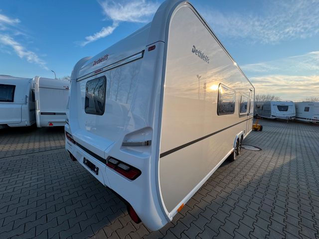 Dusch-Paket (Duschausstattung inkl. Duscharmatur und -vorhang, City-Wasseranschluss), Sicherheitspaket (ATC Trailer Control, Sicherh.-Gasdruckregl. DuoControl mit Crash Sensor und Gasreglerbeheizung EisEx, Rauchmelder), Wohnwelt Amposta, Auflastung 2.500 kg (inkl. Stahlrad 195/70 R14 C LI104), Außenblech in Glattblech titansilber-metallic, Großflächige Abstützfüße, 4 St., 17" Alufelgen im Dethleffs-Design (Tandemachser), Bugfront mit hohem Aufsatz und Dachreling, Multifunktions-Außenanschluss 12V, 220V, TV und SAT, Gasaußensteckdose