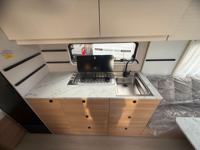 Kühlschrank 155L, Abwassertank rollbar, Antischlingerkupplung, Stoßdämpfer, Tandemachse, Autarkvorbereitung, usw.