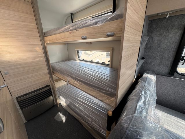 Polster Serie, Außenfarbe Silber, Fußbodentemperierung, Fenster in der eingansgtür komplett, Alufelgen, 3er Stockbett, Autarkvorbereitung, Warmwasser 5L, 12Volt Umluft, Heizung 3004, Antischlingerkupplung, TV Vorbereitung innen, Frischwasser 45L, Abwassertank rollbar, Ambiente Beleuchtung