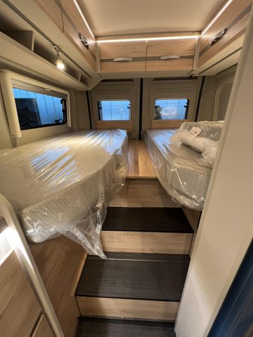 Modell 2025, Motor / Chassis: Fiat Ducato Multijet 3, Leistung: 103 kW / 140 PS, Getriebe: Automatik, zul. Gesamtgewicht: 3499 kg, Bett(en): Einzelbetten, Polster: Camino, Holzdekor: Serie