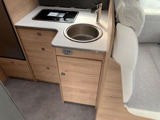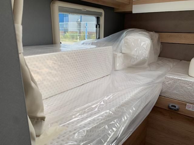 Modell 2026, Motor / Chassis: Fiat Ducato 140 MultiJet 3, Leistung: 103 kW / 140 PS, Getriebe: Automatik, zul. Gesamtgewicht: 3499 kg, Bett(en): Hubbett, Einzelbetten, Sitzgruppe: Mittelsitzgruppe, Polster: Wohnwelt Heron, Holzdekor: Noce Nagano