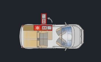 Panorama-Aufstelldach in weiß mit Komfortmatratze, JETZT NEU herausschwenkbarer Küchenblock mit Kocher und Spülbecken, Hochwertiger Möbelbau mit zahlreichen Verstaumöglichkeiten, Beistelltisch klappbar hinter den Sitzen der Reihe 1, 60Ah Aufbaubatterie, Ladebooster für optimierte Ladung der Aufbaubatterie, Ladeautomat 18A mit elektronischer Abschaltautomatik, CEE-Außenanschluss für 230V mit Sicherungsautomat, Zwei 220V Steckdosen im Wohnraum und eine 12V Steckdose im Armaturenbrett, Bodenbelag aus Holz, Fahrer- und Beifahrersitz drehbar