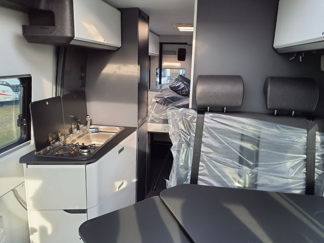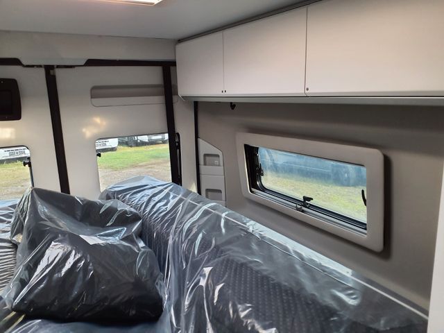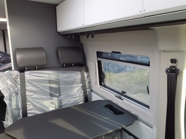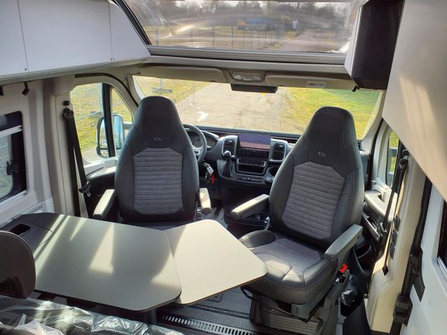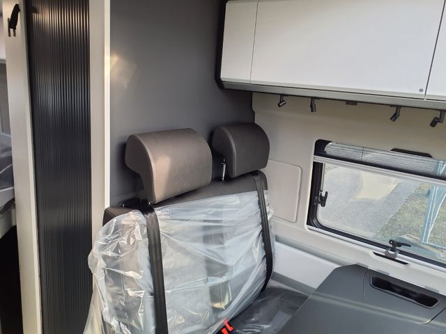 LED-Frontscheinwerfer, Nebelscheinwerfer, Regen-und Licht Assistent, Notbrems-Assistent mit Fußgängererkennung, Spurhaltewarn-Assistent Verkehrszeichen-Assistent (mit Tempomat-Geschwindigkeits-Anpassung), Fahrermüdigkeitserkennung, Geschwindigkeits-Assistent adaptiv mit Stop&Go (Stau-Assistent), Tempomat, Einparkhilfe hinten, Funk-Zentralverriegelung, Außenspiegel elektrisch verstell- und beheizbar, Klimaautomatik Fahrerhaus, 7" Instrumentenanzeige digital, Radio Vorbereitung Fahrerhaus, 10''DAB-Naviceiver, Rückfahrkamera, Lenkrad in Lederoptik, Multifunktionslenkrad mit Radiofernbedienung, Handbremse elektrisch, Komfortsitze Fahrerhaus mit Armlehnen im Wohnraumdesign /drehbar/ höhenverstellbar, 16" Leichtmetall-Felgen, Lackierung Stoßfänger vorne, Fahrerhaus- und Wohnraum-Scheiben getönt, Wohnraum-Seitenfenster mit Rahmen Fenster inkl. Kombirollo in Hecktür links Falt-Verdunkelung Fahrerhaus, Falt-Verdunkelung Wohnraum-Seitenfenster, Stopper an Schiebetür, Fliegenschutztür an Schiebetür, Einstiegsstufe elektrisch und Einstiegsbeleuchtung, LED-Ambientebeleuchtung, Lade-Booster, Solar-Anlage, Sicherheits-Gasregler MonoControl CS Gasfilter, Abwassertank isoliert und beheizba,r Abwasserablassventil elektrisch, Abdeckung Kocher /Spüle, Tisch mit Ausdreherweiterung und Becherhalterung, Sonnenschutz-Markise