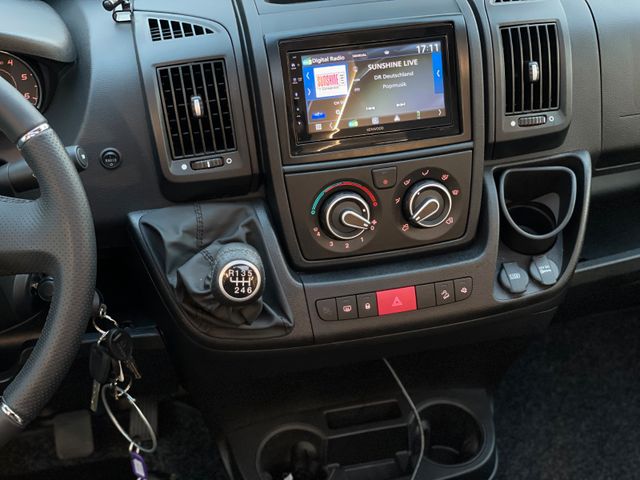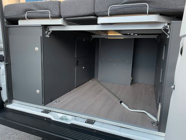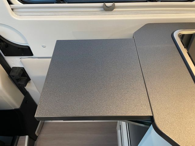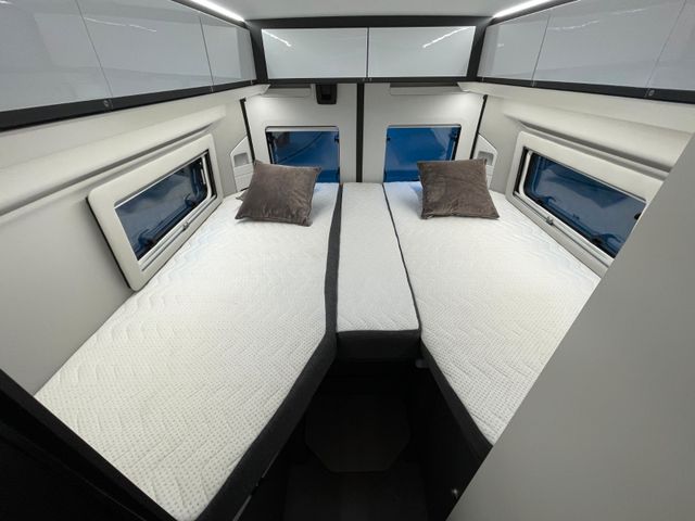 Serienausstattung Twin Supreme, Kit De Luxe, Serienpolster "Arno" in weiß, Rückfahrkamera mit Rückspiegel-Monitor, Zuziehhilfe für Schiebetür (inklusive im Kit DE LUXE), Markise, Solaranlage 120 W, AHK Starr (Anhängerkupplung), 2DIN Radio inkl. Rückfahrkamera