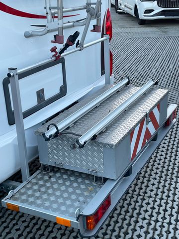 Automatikgetriebe, Chassis-Paket, Fliegenschutztür, Radio, Rückfahrkamera + Monitor, Markise, Skyroof, Automatische Sat-Anlage + TV, Rollerbühne bis 100 kg + Transportbox, Sommerreifen (als Beiladung)
