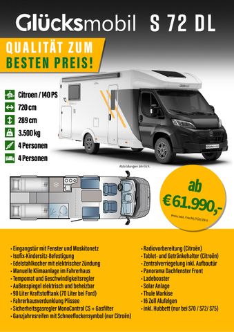 Das Glücksmobil S 72 DL bietet ein großzügiges Raumgefühl bei gleichzeitig handlichen Abmessungen. Die längs angeordneten Einzelbetten im Heck, das breite manuelle Hubbett über der Face-to-Face-Sitzgruppe und der besonders großzügige Wohnbereich machen ihn ideal für bis zu vier Personen. Das Schwenkbad schafft einen praktischen, flexiblen und separierten Badbereich. Mit großer Heckgarage und moderner LED-Beleuchtung ist der S 72 DL ein vielseitiges Reisemobil für alle, die Wert auf Platz, Komfort und ein gut durchdachtes Raumkonzept legen.