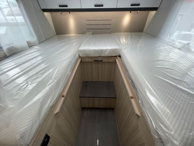 Das Glücksmobil S 75 SL macht jede Reise zum Erlebnis – clever geplant, komfortabel eingerichtet und ideal für bis zu fünf Personen. Die längs angeordneten Einzelbetten im Heck laden zu erholsamen Nächten ein, während das breite manuelle Hubbett über der Halbdinette zusätzlichen Schlafplatz bietet. Die vier komfortablen Sitzplätze im Wohnbereich machen gemeinsame Stunden unterwegs besonders gemütlich. Das getrennte Dusche-/WC-Bad sorgt für Flexibilität und Privatsphäre, egal wohin die Reise geht. Durchdachter Stauraum, moderne LED-Beleuchtung und ein cleverer Grundriss machen den S 75 SL zu einem Reisemobil, das Platz, Komfort und Alltagstauglichkeit perfekt vereint – ideal für alle, die unterwegs nicht auf ein Zuhausegefühl verzichten wollen.