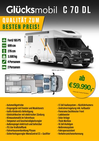 Der C 70 DL kombiniert handliche Maße mit durchdachtem Raumkonzept und solider Serienausstattung. Auf knapp 7 m Länge und 2,12 m Breite bietet er Komfort und Funktionalität für Reisen zu zweit oder mit gelegentlichem Gast. Im Heck befinden sich zwei feste Längs‑Einzelbetten — ideal für erholsame Nächte. Das Schwenkbad sorgt für Flexibilität, Komfort und Privatsphäre unterwegs. Eine mittige Küche mit großzügigem Kühlschrank, sauberes Wassermanagement (Frisch‑ und Abwassertank) und Heizung machen ihn alltagstauglich — egal, ob Kurztrip oder längerer Urlaub. Damit ist der C 70 DL ein smartes Reisemobil für alle, die ein kompaktes, zuverlässig ausgestattetes Zuhause auf Rädern suchen.