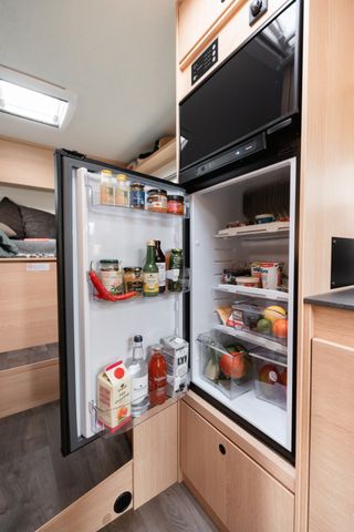 Wassertank inkl. Boiler 122 l, Abwassertank 92 l, Kühlschrank 78 l mit Gefrierfach 11 l, 2-Flammkocher mit Piezo Zündung und Glasabdeckung, Geräumige Schublade mit Servo-Soft im Küchenblock, Ergonomisch angeordnete Küche mit großzügiger Arbeitsfläche, Abfalleimer