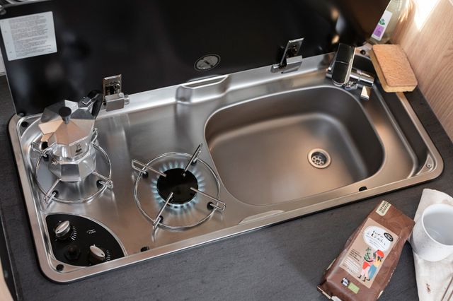 Wassertank inkl. Boiler 122 l, Abwassertank 92 l, Kühlschrank 78 l mit Gefrierfach 11 l, 2-Flammkocher mit Piezo Zündung und Glasabdeckung, Geräumige Schublade mit Servo-Soft im Küchenblock, Ergonomisch angeordnete Küche mit großzügiger Arbeitsfläche, Abfalleimer
