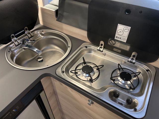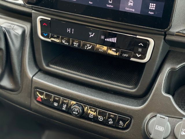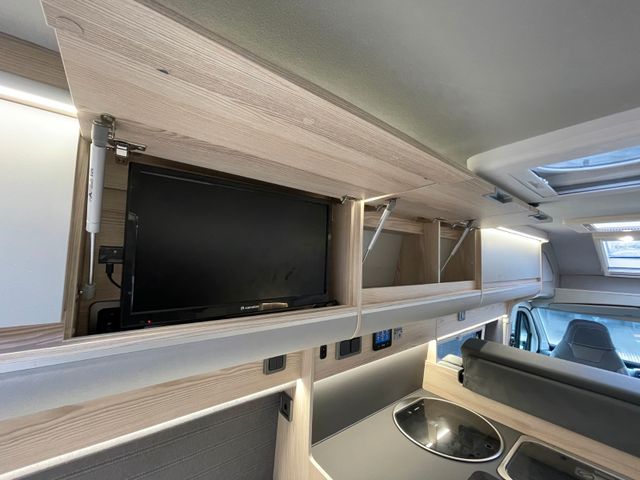 Komfort & Sicherheit: Automatikgetriebe, pneumatische Hinterachsfederung, Tempomat, Klimaanlage, ABS, Fahrer- und Beifahrerairbag, Alufelgen, Softclose-Funktion, Energie & Elektronik: Solarpaket 290 W mit MPPT-Regler und Bluetooth, LiFePO4-Wohnraumbatterie 150 Ah, Wechselrichter 1700 Watt, Smart TV, 2 Zusatzlautsprecher, Wohnen & Praktisches: Doppelbett, Heckgarage, Markise, Anhängerkupplung, Duschtassenmatte aus Holz, RFK (Rückfahrkamera), Sonstiges: Umweltplakette grün (Euro 6), 4. eingetragene Sitzplätze