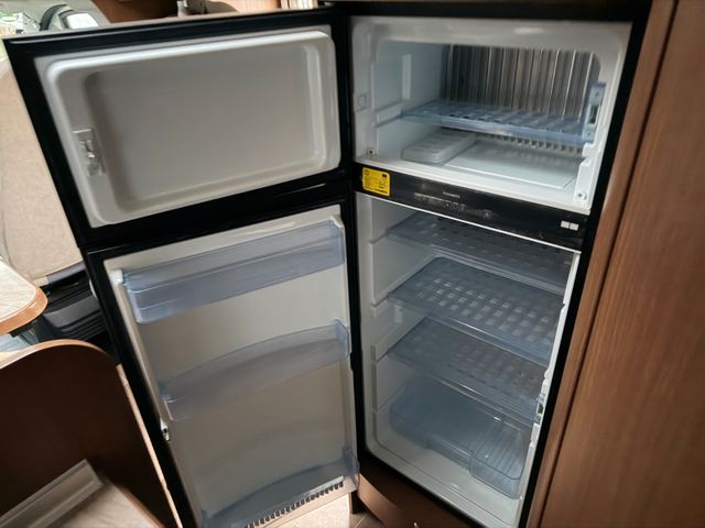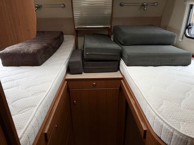 Küche, Großer Kühlschrank mit extra Frosterfach, Truma Heizung / Warmwasser, 3 Flamm Gaskocher, Nasszelle mit Cassettentoilette, separate Dusche, Bettumbau Sitzgruppe für 2 Personen, Einzelbetten, Große Garage, 2. Garagenklappe